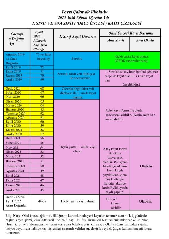 2025-2026 Eğitim Öğretim Yılı için, okulumuzun birinci sınıflarına öğrenci kayıtları; çocuklarımızın MERNİS bilgileri esas alınarak, herhangi bir başvuru olmaksızın, Bakanlığımız tarafından e-Okul Yönetim Bilgi Sistemi üzerinden yapılmıştır.